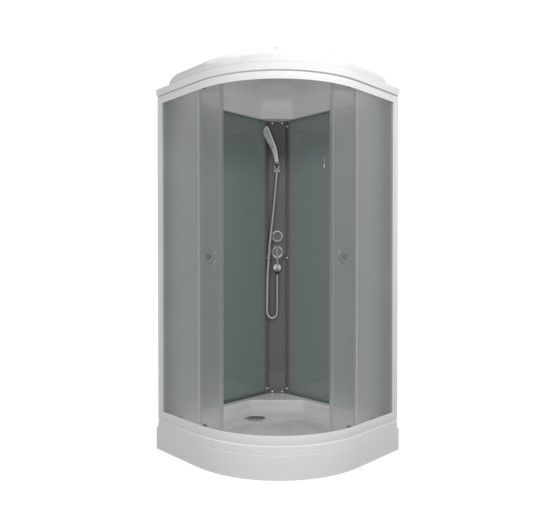 Размеры 90x90x215 см — четверть круга, идеально для угловой установки в маленькой ванной.